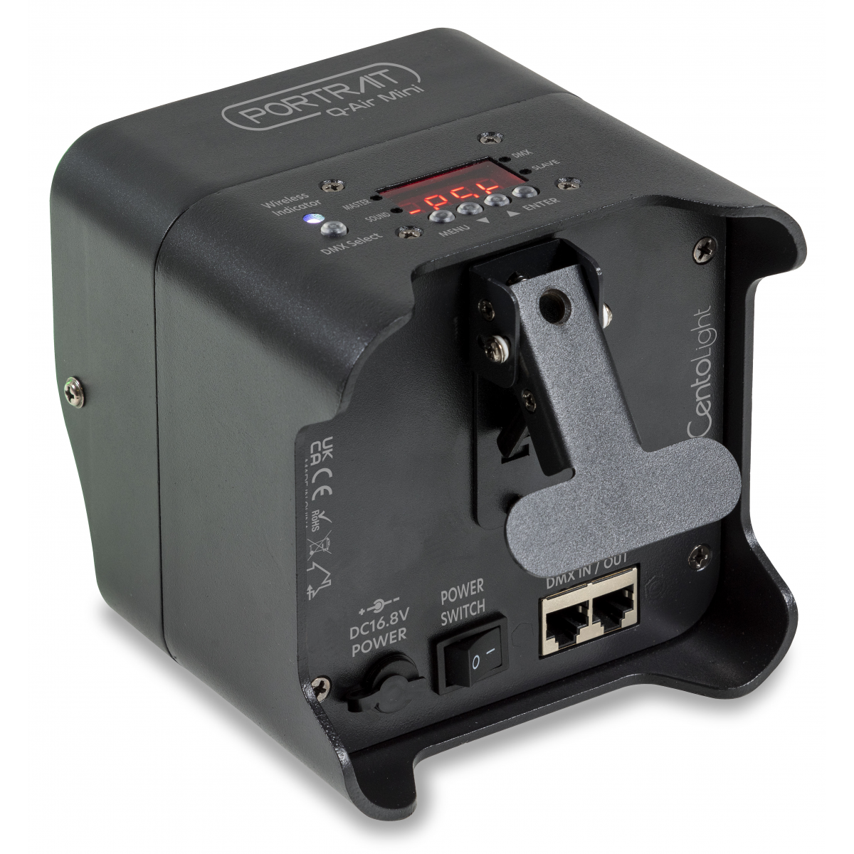 PORTRAIT Q-Air Mini è un PAR alimentato a batteria (o a corrente), progettato per applicazioni di noleggio. Può essere controllato facilmente scegliendo tra telecomando IR, connessione DMX-512 cablata, DMX wireless (usando il ricetrasmettitore DMX wireless a 2,4 GHz AIRCOM-126), Auto Run, Master/Slave e controllo Sound.