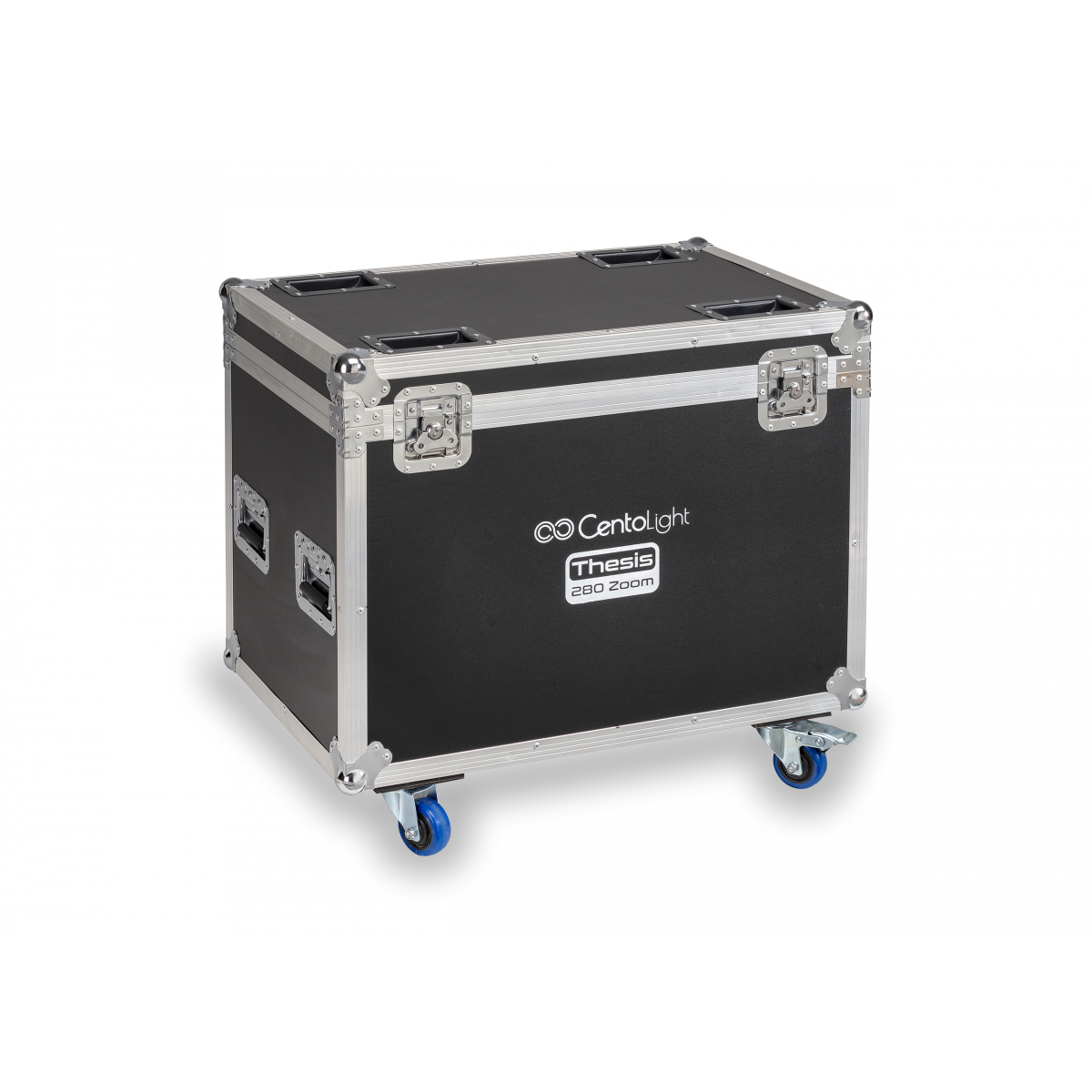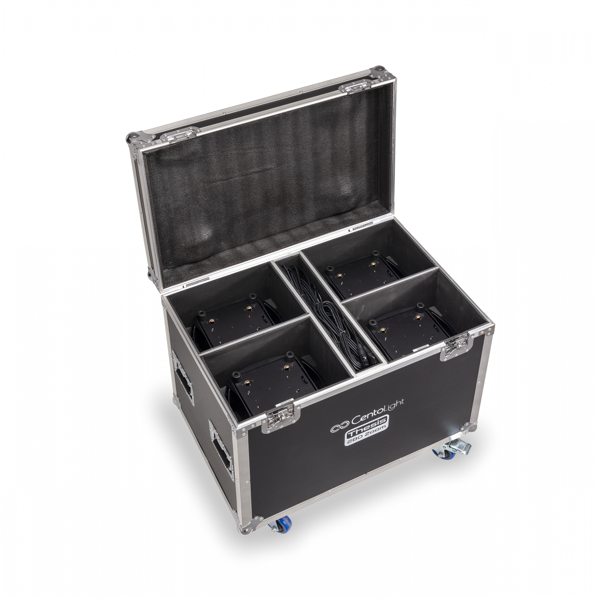 | Flight Case con ruote (2 ruote con freno) e spazio nella parte superiore per il contenimento a testa in giù delle teste con i ganci montati sulla base del faro. | |